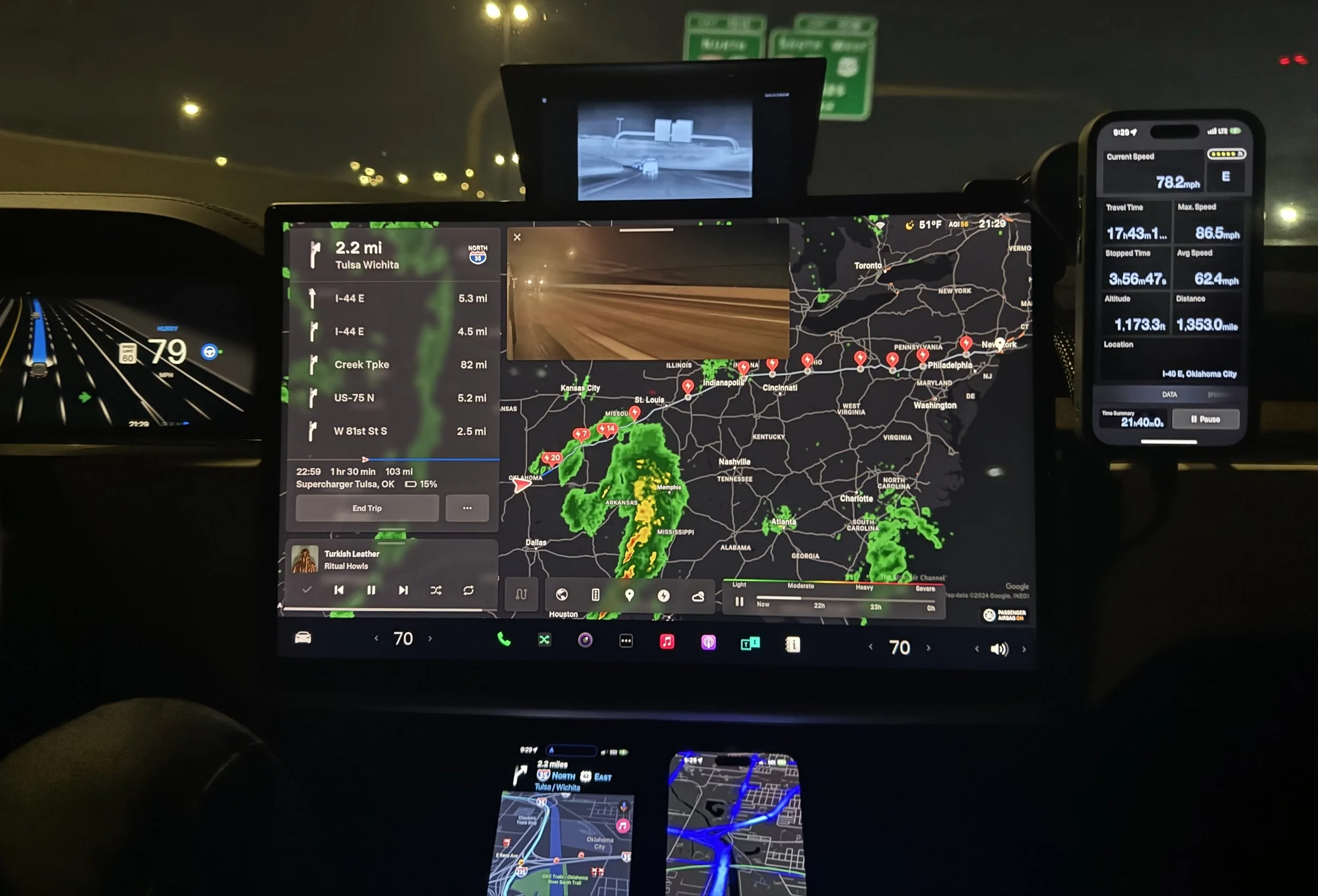 Interior cockpit @ night. FLIR display @ top center, Waze @ bottom left, Highway Radar @ bottom right.