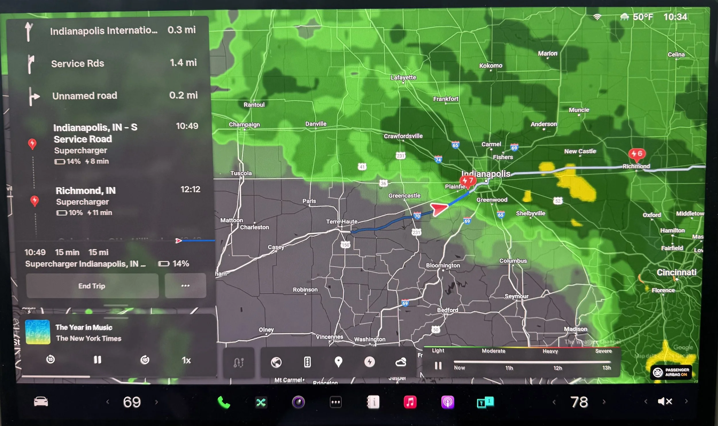 Tesla Nav screen indicating moderate rainstorm, which precipitated multiple IVDEs, and drive cancellation for safety.